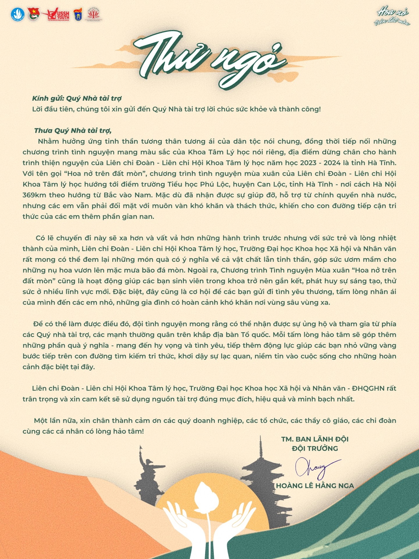 THƯ NGỎ CHƯƠNG TRÌNH TÌNH NGUYỆN MÙA XUÂN 2024 "HOA NỞ TRÊN ĐẤT MÒN"
